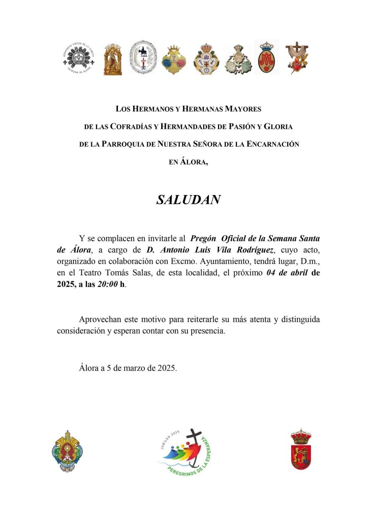 La planificación comienza con un importante acontecimiento. Las Hermandades de Pasión y Gloria de Álora invitan al Pregón Oficial de la Semana Santa, el cuál dará lugar en el Teatro Tomás Salas a las 20:00 horas. El encargado de presentar dicho acto es Antonio Luis Vila Rodríguez y la organización ha sido tarea de las distintas Cofradías, en colaboración con el Ayuntamiento.