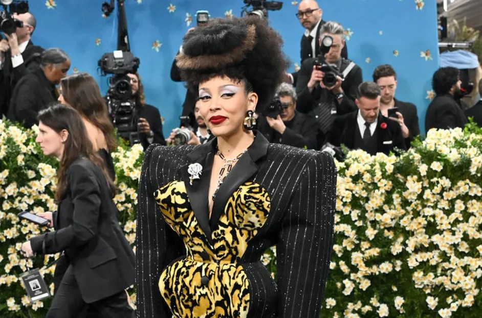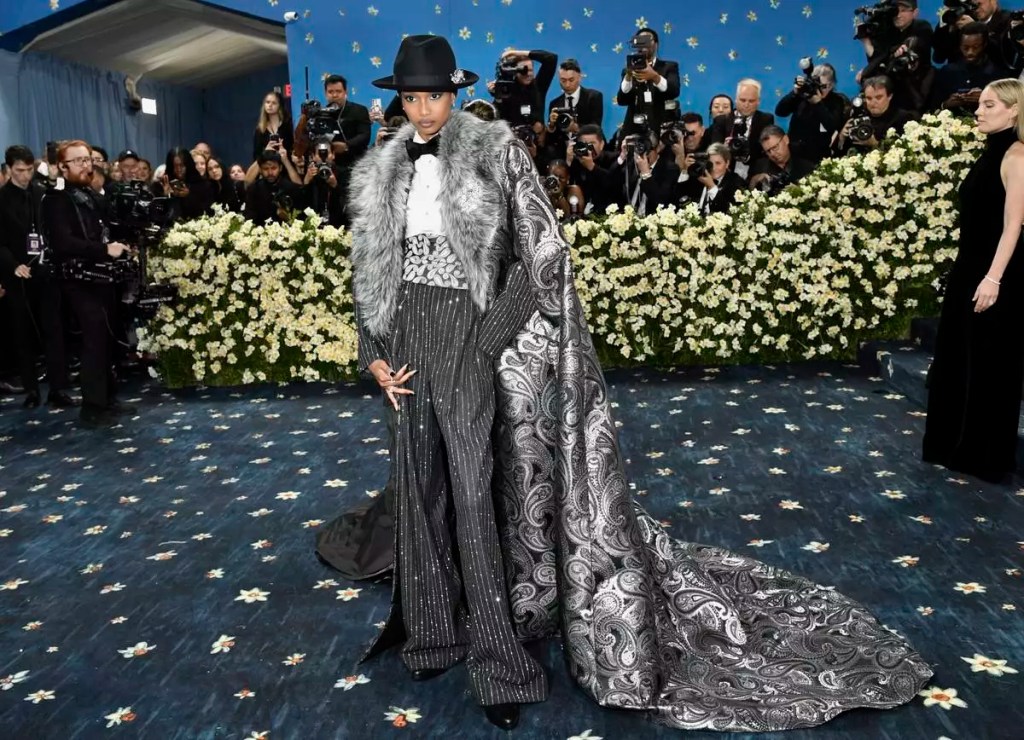 La polifacética artista estadounidense es la definición de que, a veces, más es más. Se arriesga con un traje, diseñado por Ruth E. Carter, que combina los tonos grises con el burdeos, al puro estilo zoot al ensanchar en hombros y cintura; además de la larga capa y chaqueta. Combina las pedrerías de sus accesorios con las plumas del sombrero y la elegancia del conjunto. Los zapatos mantienen la estética buscada. Un bastón, típico de los referentes de la época, pone la guinda al pastel. La intención es clara: personificar a la rosa de Harlem, título de una de sus canciones.