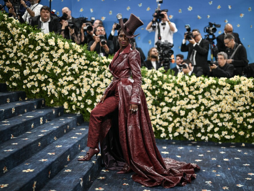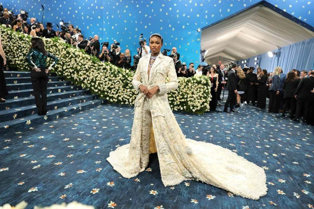 La ganadora de un premio GRAMMY se estrena en la MET por todo lo alto con un conjunto de Manish Malhotra. Un pantalón blanco lleno de pedrerías que completa una chaqueta con adornos de motivos botánicos. Esta termina en una larga cola, causando una explosión de sensaciones al reposar en las escaleras semejante cascada de flores.