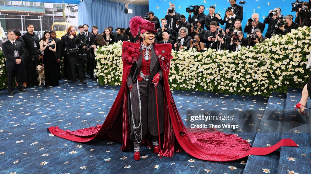 Con un diseño de Thom Browne, la reina del rap aparece en el evento. Un vestido que sigue las pautas de la temática al imitar a un traje en sus cortes, estampados y motivos como los bolsillos o los botones. Además, la complementa un accesorio floral que cae desde su hombro derecho. A pesar de todo, a Nicki no se la vio con un gran entusiasmo por estar allí…